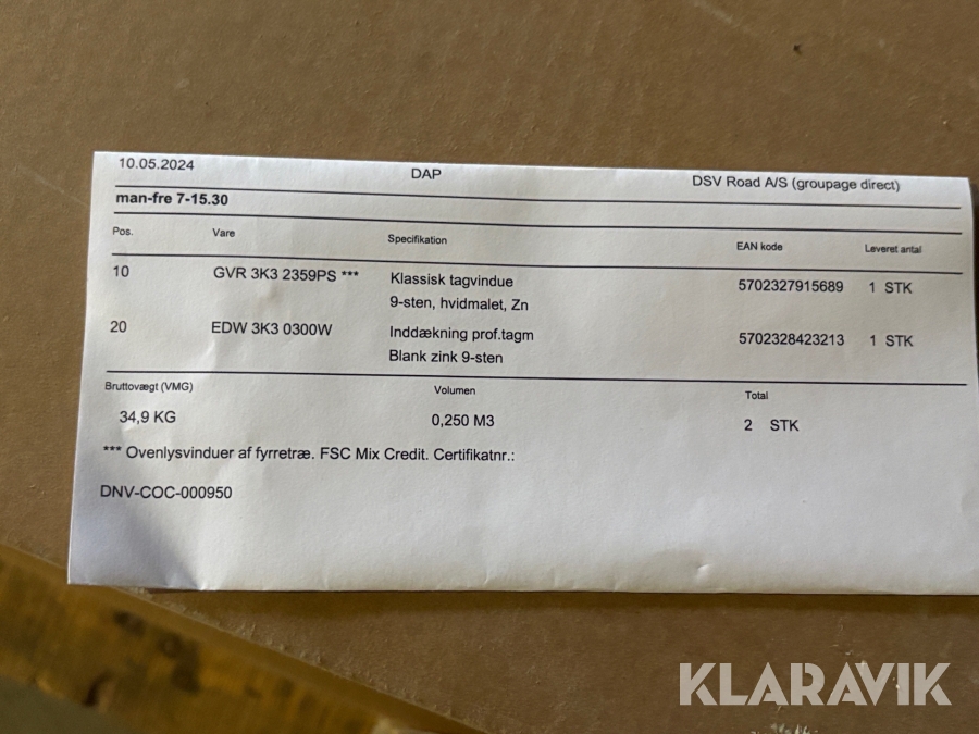 Som køber skal du kontrollere objektet ved afhentning Herefter kan der ikke gøres indvendinger. Hvis objektet adskiller sig væsentligt fra beskrivelsen, skal Klaravik kontaktes inden objektet fragtes (bemærk, at der gælder særskilte vilkår for konkursauktioner). Alle objekt findes hos den sælgende virksomhed, og du som køber har ansvar for afhentning og fragt. Som køber har du 12 dage til at afhente objektet, efter auktionen er afsluttet.