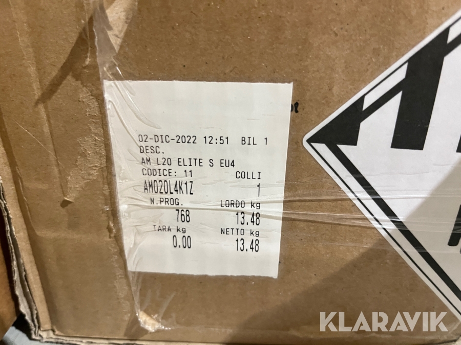 Som køber skal du kontrollere objektet ved afhentning Herefter kan der ikke gøres indvendinger. Hvis objektet adskiller sig væsentligt fra beskrivelsen, skal Klaravik kontaktes inden objektet fragtes (bemærk, at der gælder særskilte vilkår for konkursauktioner). Alle objekt findes hos den sælgende virksomhed, og du som køber har ansvar for afhentning og fragt. Som køber har du 15 dage til at afhente objektet, efter auktionen er afsluttet.