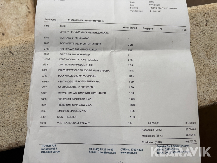 Som køber skal du kontrollere objektet ved afhentning Herefter kan der ikke gøres indvendinger. Hvis objektet adskiller sig væsentligt fra beskrivelsen, skal Klaravik kontaktes inden objektet fragtes (bemærk, at der gælder særskilte vilkår for konkursauktioner). Alle objekt findes hos den sælgende virksomhed, og du som køber har ansvar for afhentning og fragt. Som køber har du 15 dage til at afhente objektet, efter auktionen er afsluttet.
