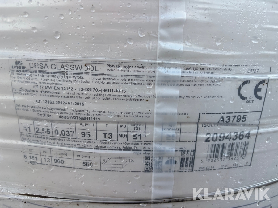 Glasuld isoleringsbatts URSA A37 – 95 mm, 161 m²