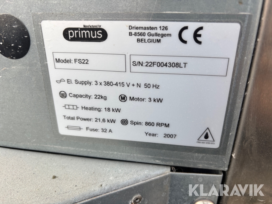 Industri vaskemaskine Primus FS22 automatisk doseringssystem.