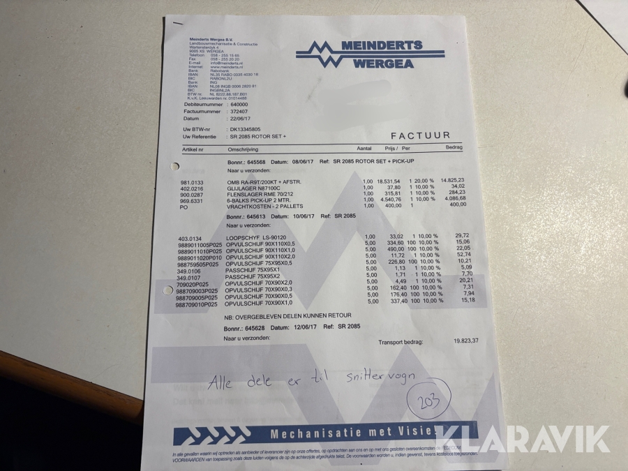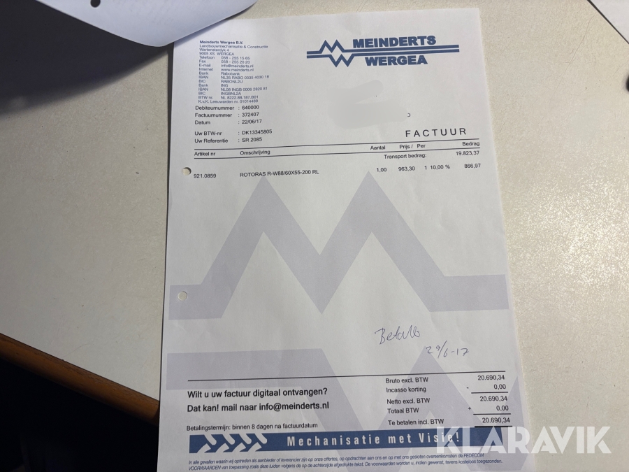 Som køber skal du kontrollere objektet ved afhentning Herefter kan der ikke gøres indvendinger. Hvis objektet adskiller sig væsentligt fra beskrivelsen, skal Klaravik kontaktes inden objektet fragtes (bemærk, at der gælder særskilte vilkår for konkursauktioner). Alle objekt findes hos den sælgende virksomhed, og du som køber har ansvar for afhentning og fragt. Som køber har du 15 dage til at afhente objektet, efter auktionen er afsluttet.