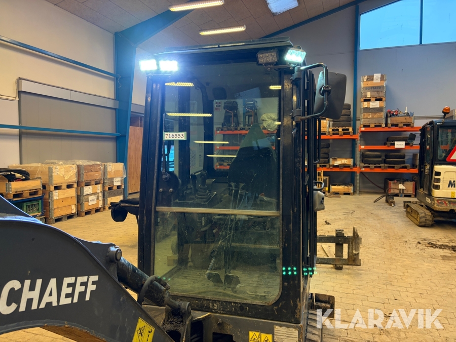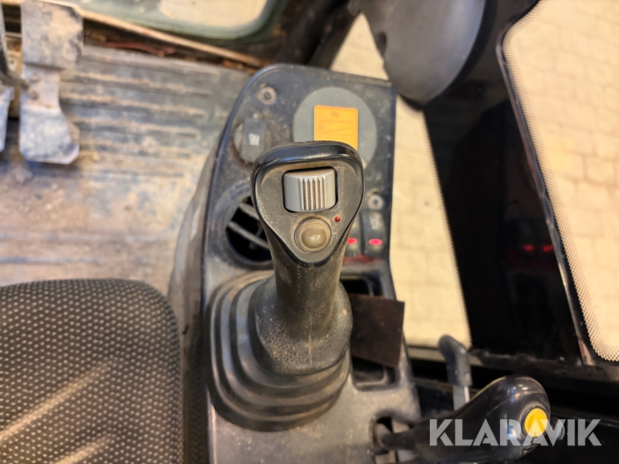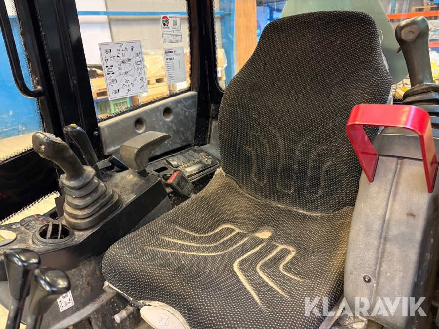 Maskinen er udstyret med lukket kabine og gummibælter.