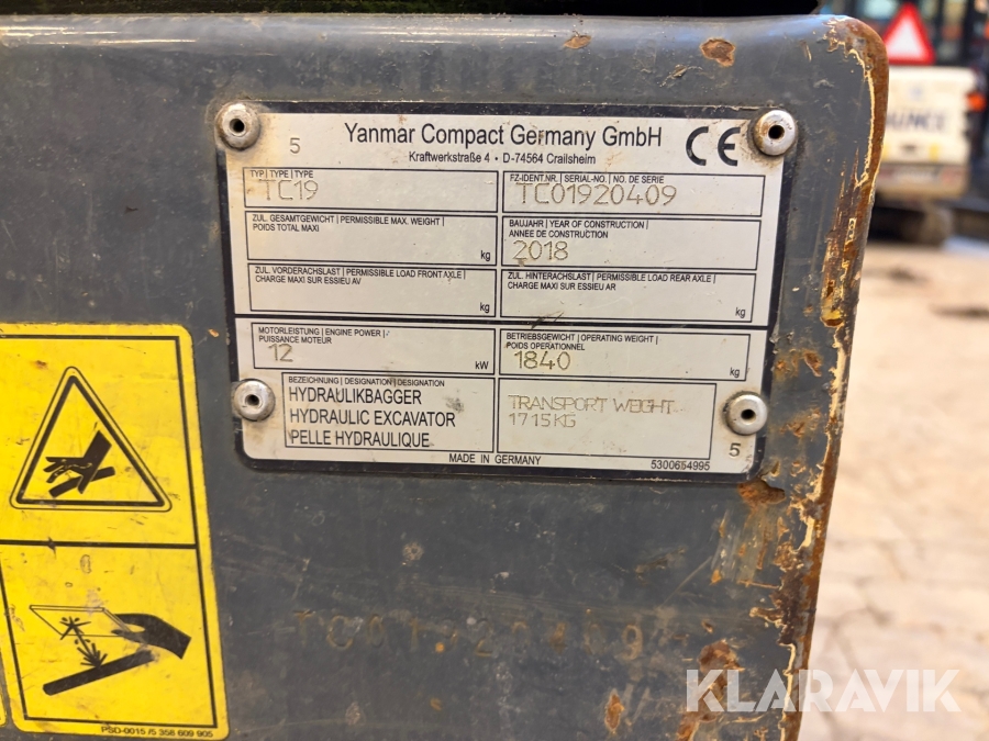 Hydraulisk gravemaskine fra Yanmar Compact Germany GmbH, model TC19, årgang 2018. Maskinen er CE-mærket og fremstillet i Tyskland.