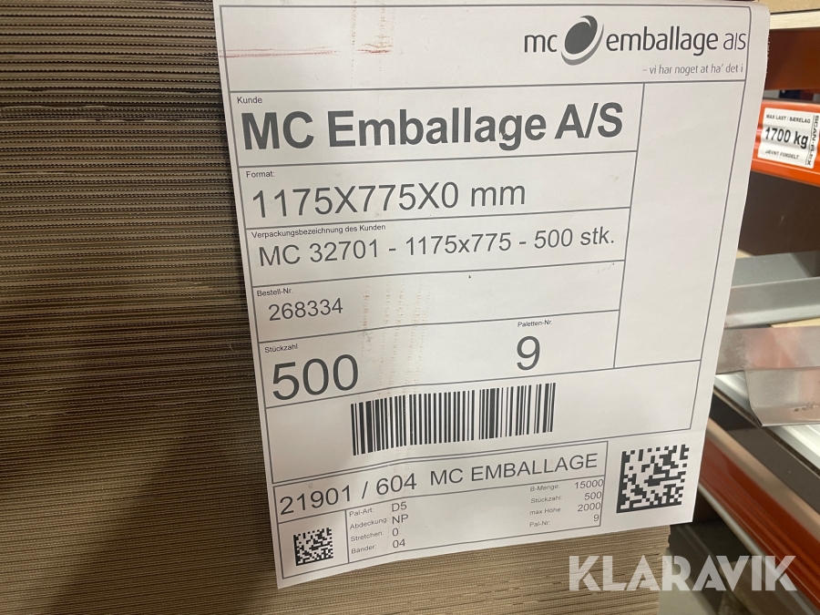 Pap plader MC emballage 1175x775mm 500 styk