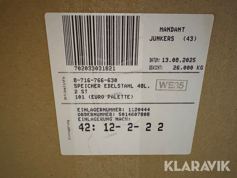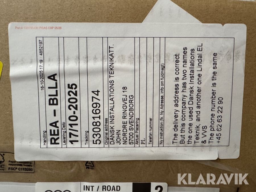 Som køber skal du kontrollere objektet ved afhentning Herefter kan der ikke gøres indvendinger. Hvis objektet adskiller sig væsentligt fra beskrivelsen, skal Klaravik kontaktes inden objektet fragtes (bemærk, at der gælder særskilte vilkår for konkursauktioner). Alle objekt findes hos den sælgende virksomhed, og du som køber har ansvar for afhentning og fragt. Som køber har du 15 dage til at afhente objektet, efter auktionen er afsluttet.