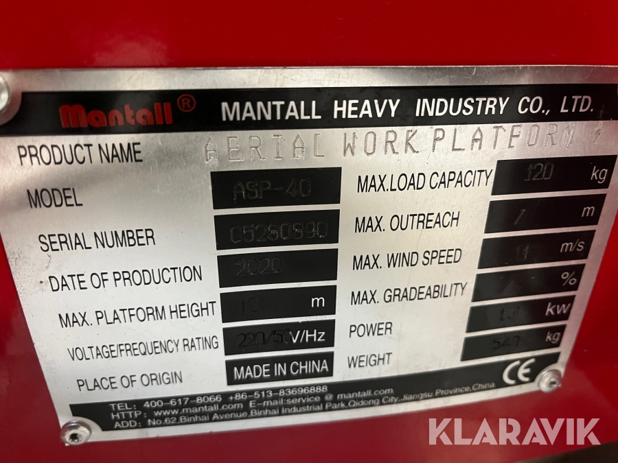 Søjlelift / arbejdsplatform Mantall ASP40 - 12 meter