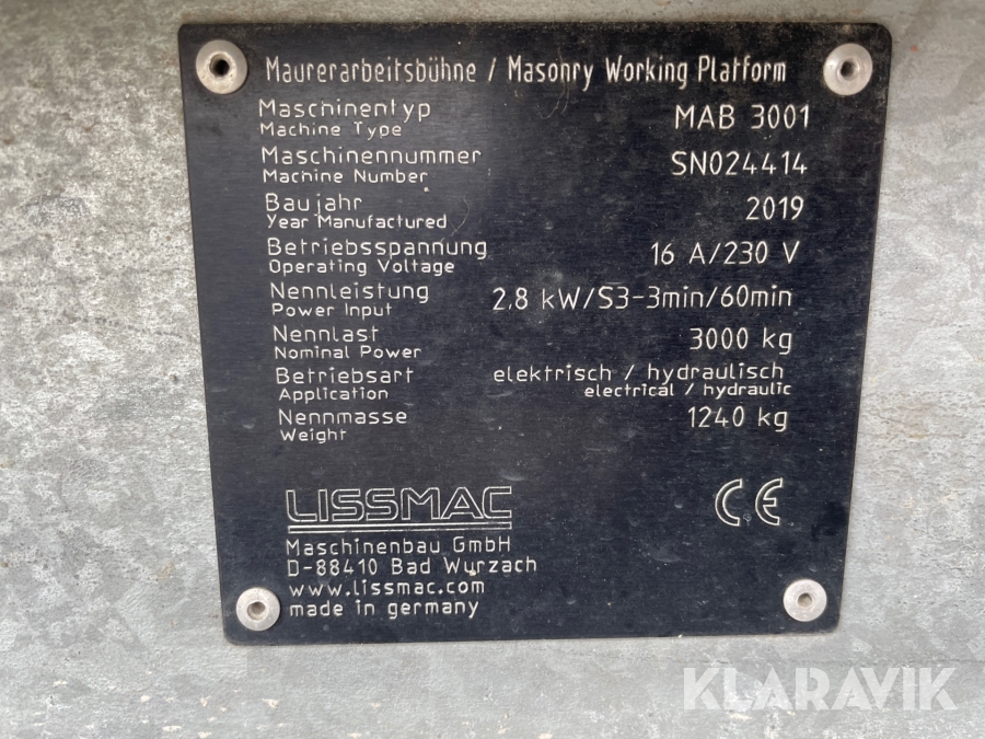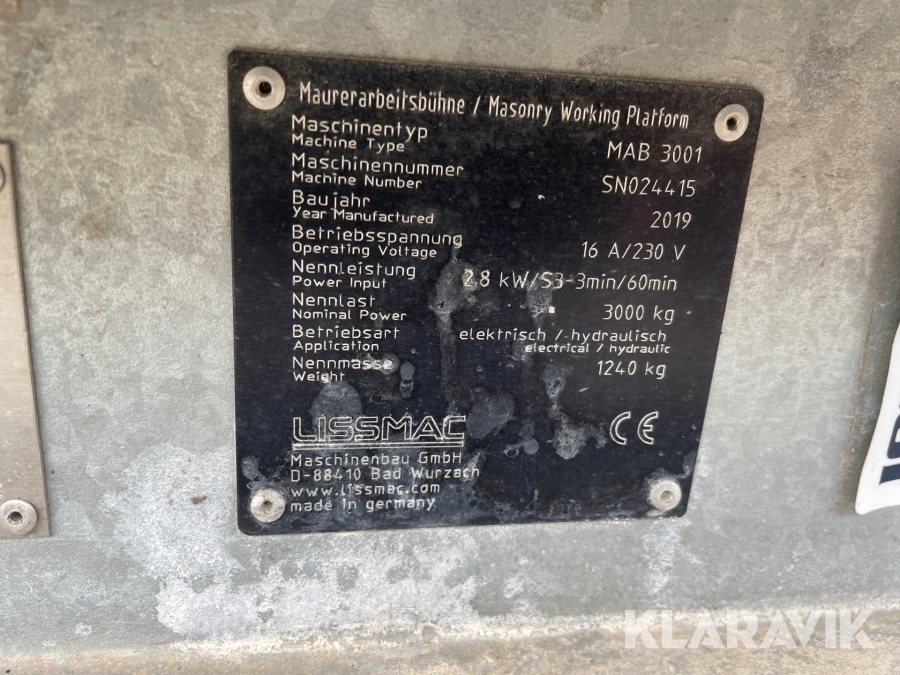 Murerarbejde lift Lissmac MAB3001 2 styk