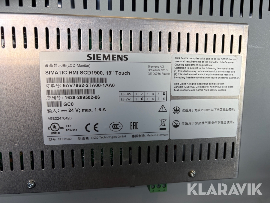 Styreskærm/touch skærm Siemens Simatic HMI SCD1900 19"