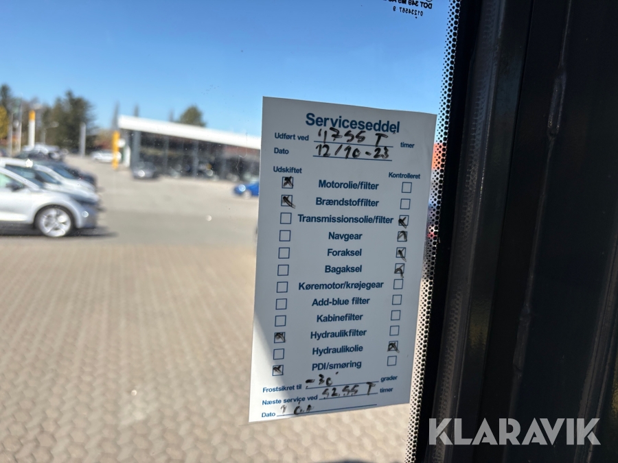 Ved service er der udført kontrol på transmissionsolie/filter, navgear, foraksel, bagaksel og hydraulikolie.