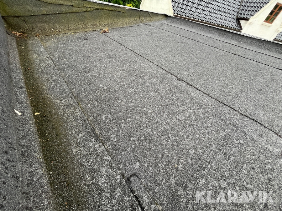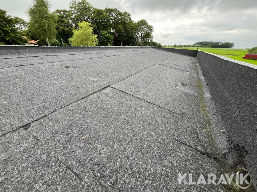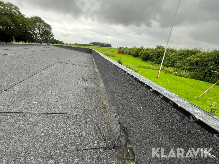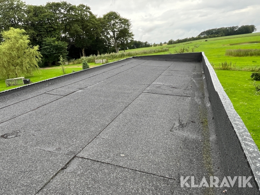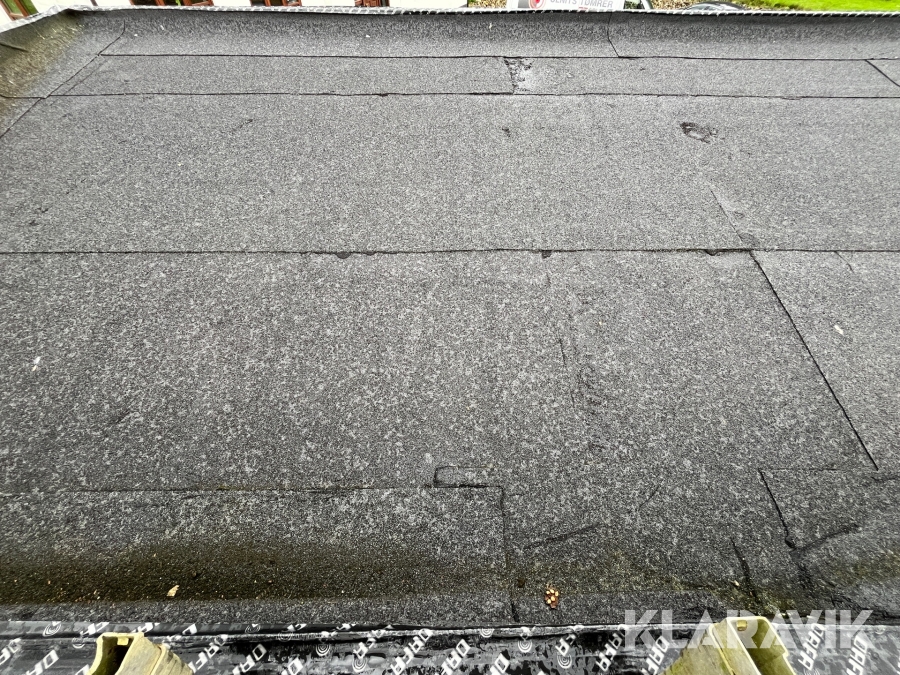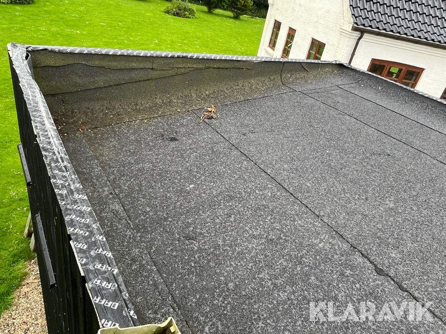 - Tag med tagpap og 15 grader hældning. Mangler inddækninger på kanter.